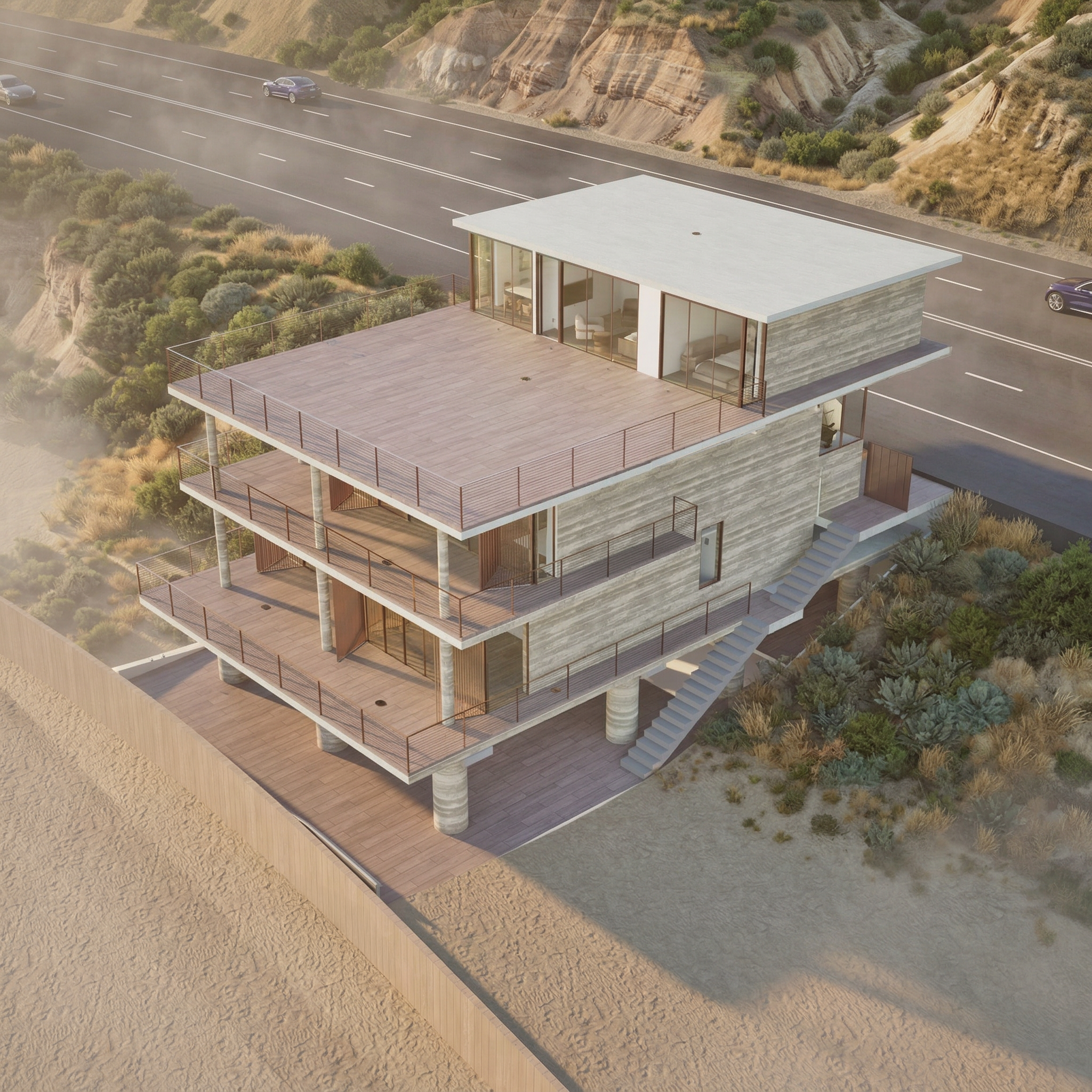 Wooden screens wrap the living spaces, filtering light and view while providing privacy from the beach and highway beyond. When closed, the house feels calm and deliberately inward-looking.