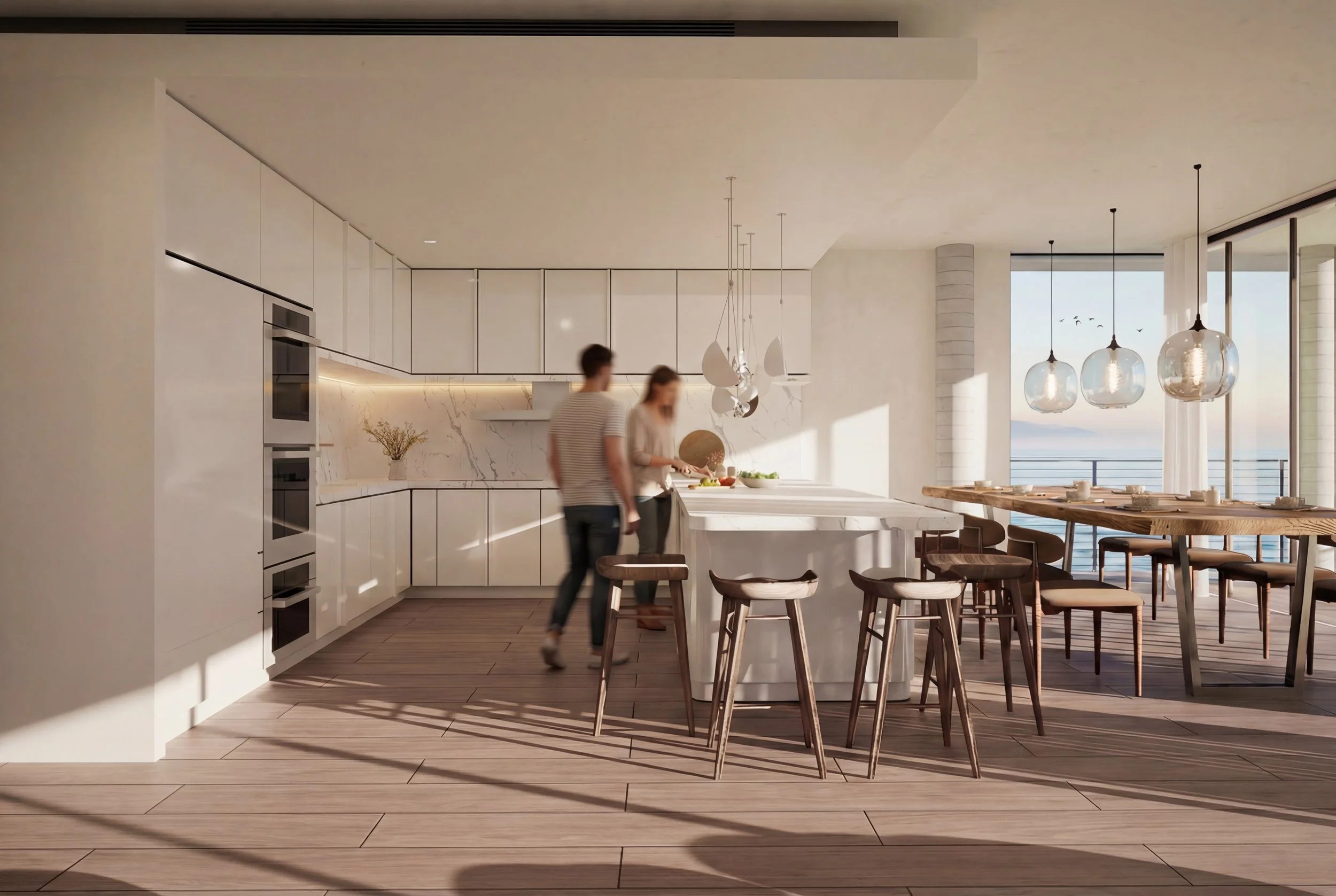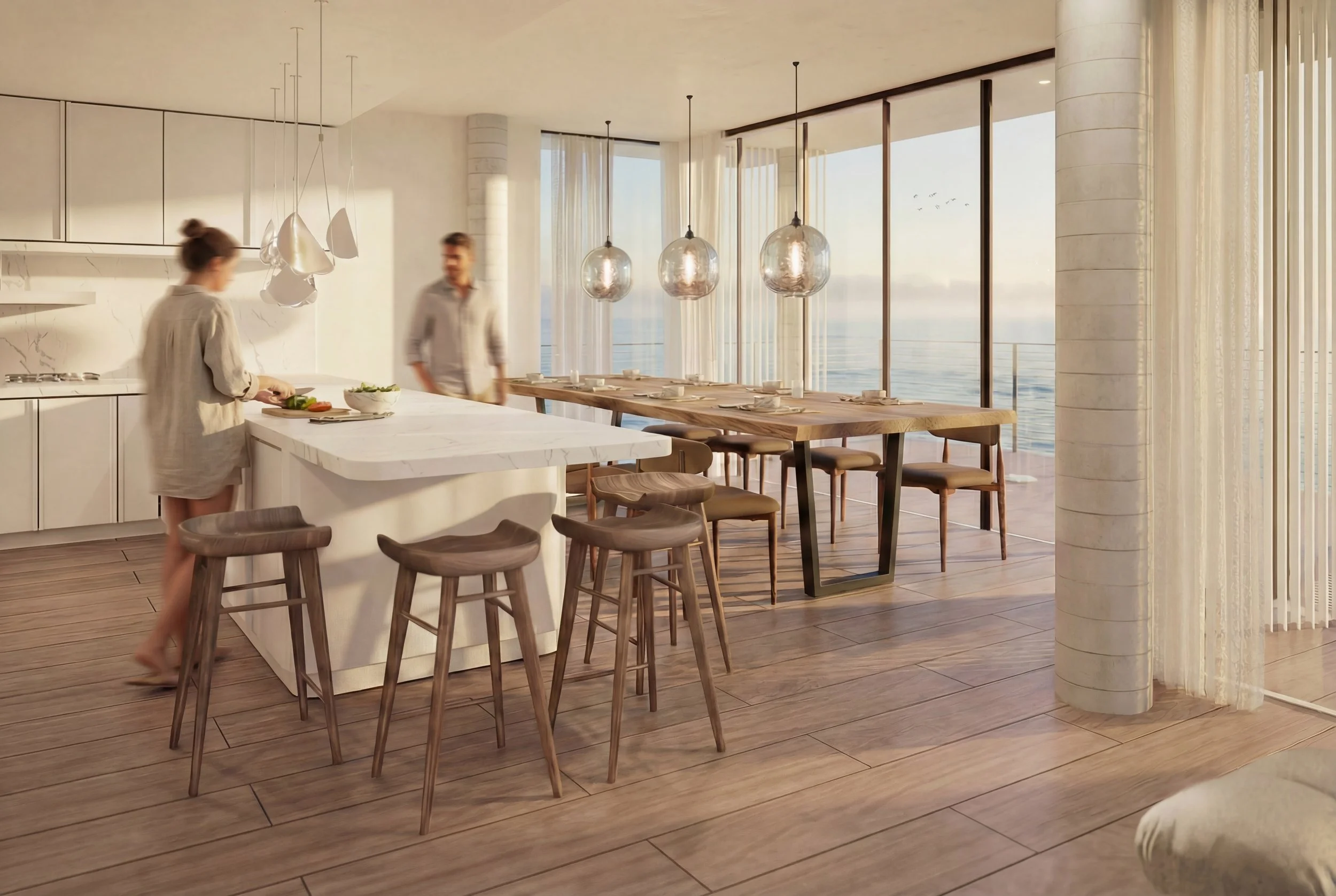 Material choices reinforce this flexibility. A resilient structural system anchors the building against coastal and environmental forces, while lighter wood elements bring warmth, tactility, and human scale. Light moves across ceilings and screens throughout the day, marking time quietly rather than dramatically.