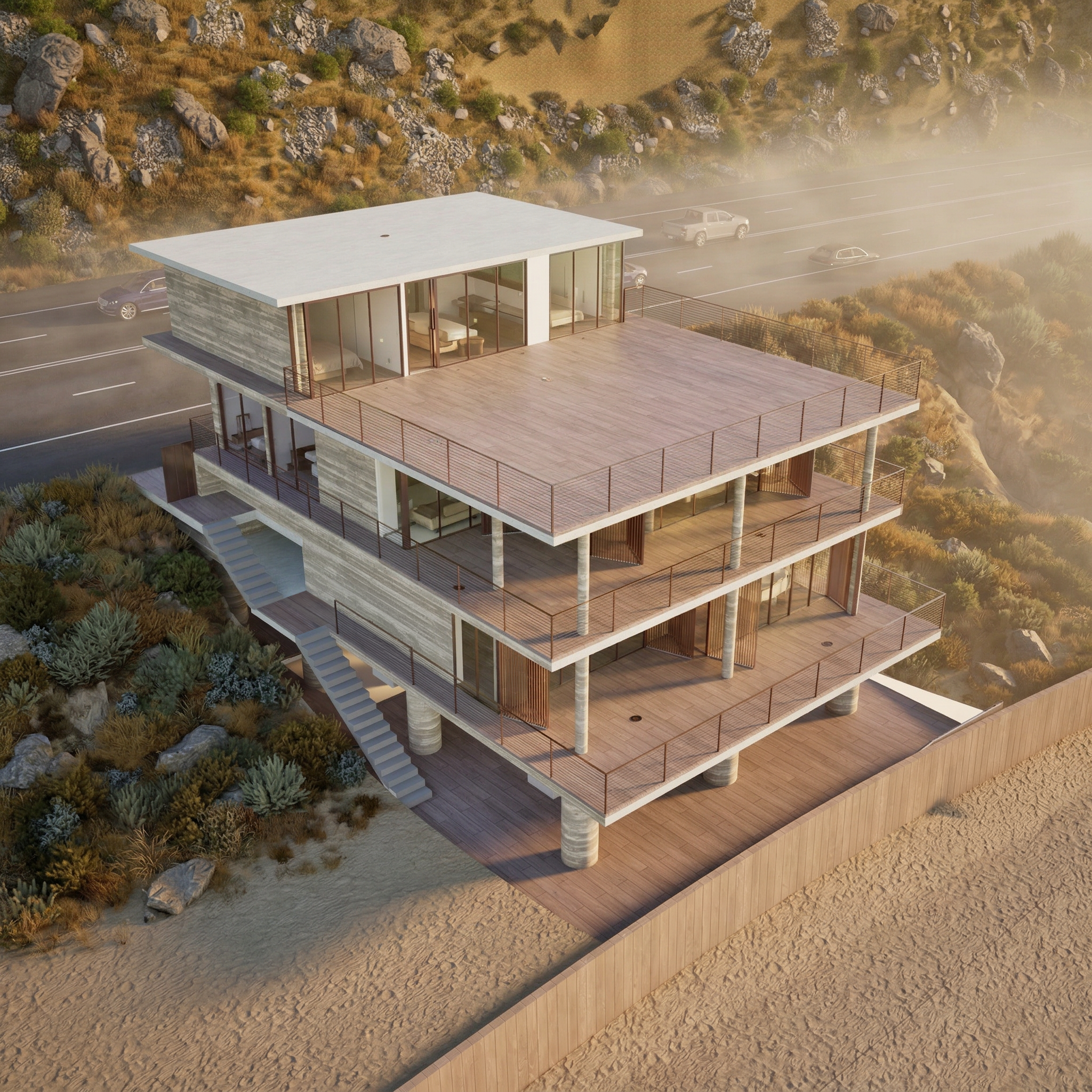 Set between the Pacific and the hillside, the architecture responds to Malibu’s conditions not through a single gesture, but through layers. Deep floor plates, generous overhangs, and operable wood screens allow the house to open or close, soften or shelter, depending on season, time of day, and mood.